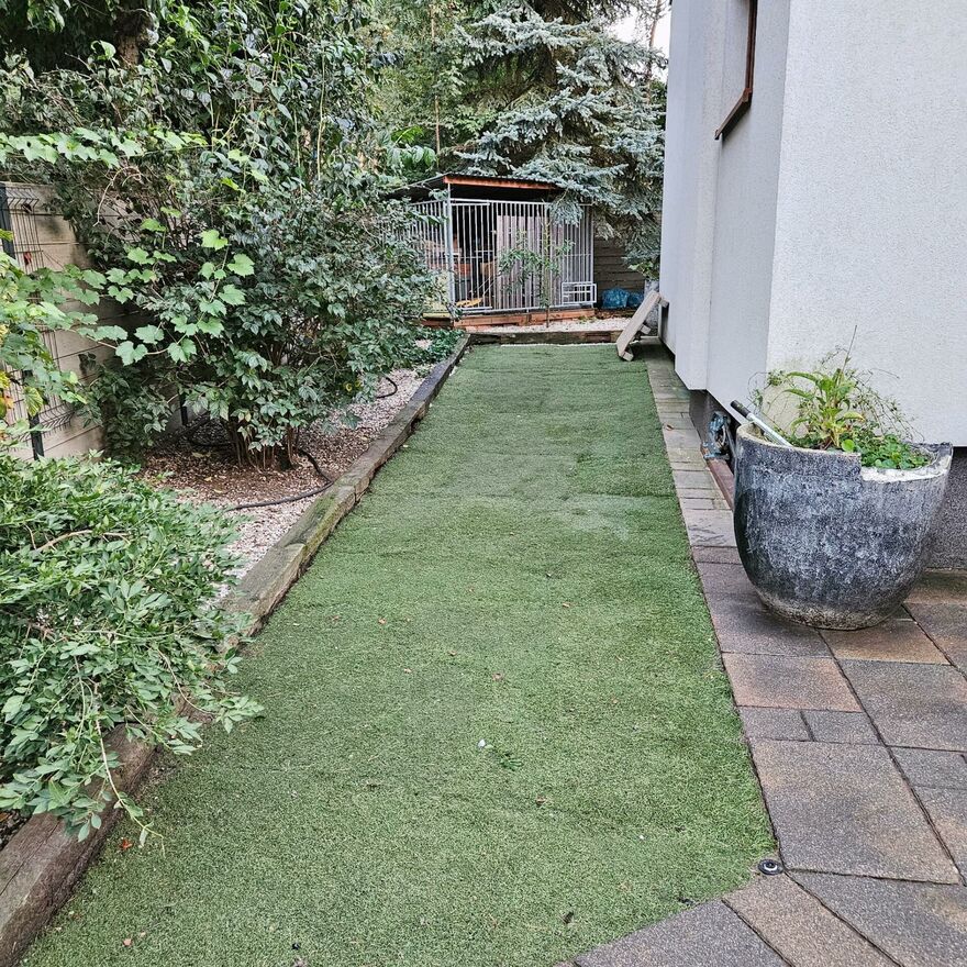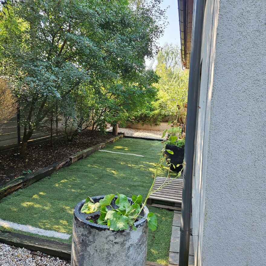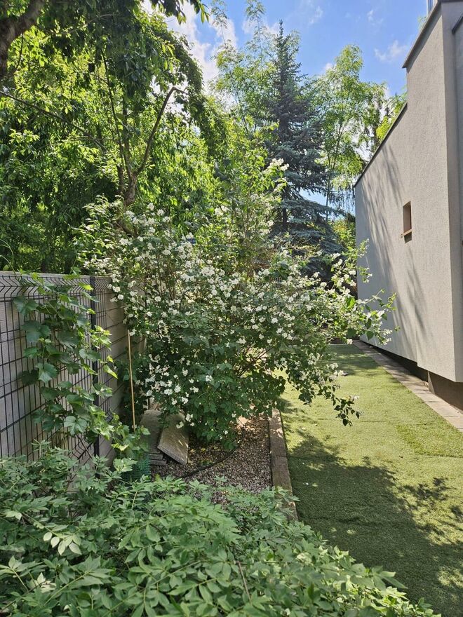 W ogrodzie, który został starannie zagospodarowany, znajdziesz liczne nasadzenia, automatyczne nawadnianie oraz przestrzeń do relaksu i zabawy.